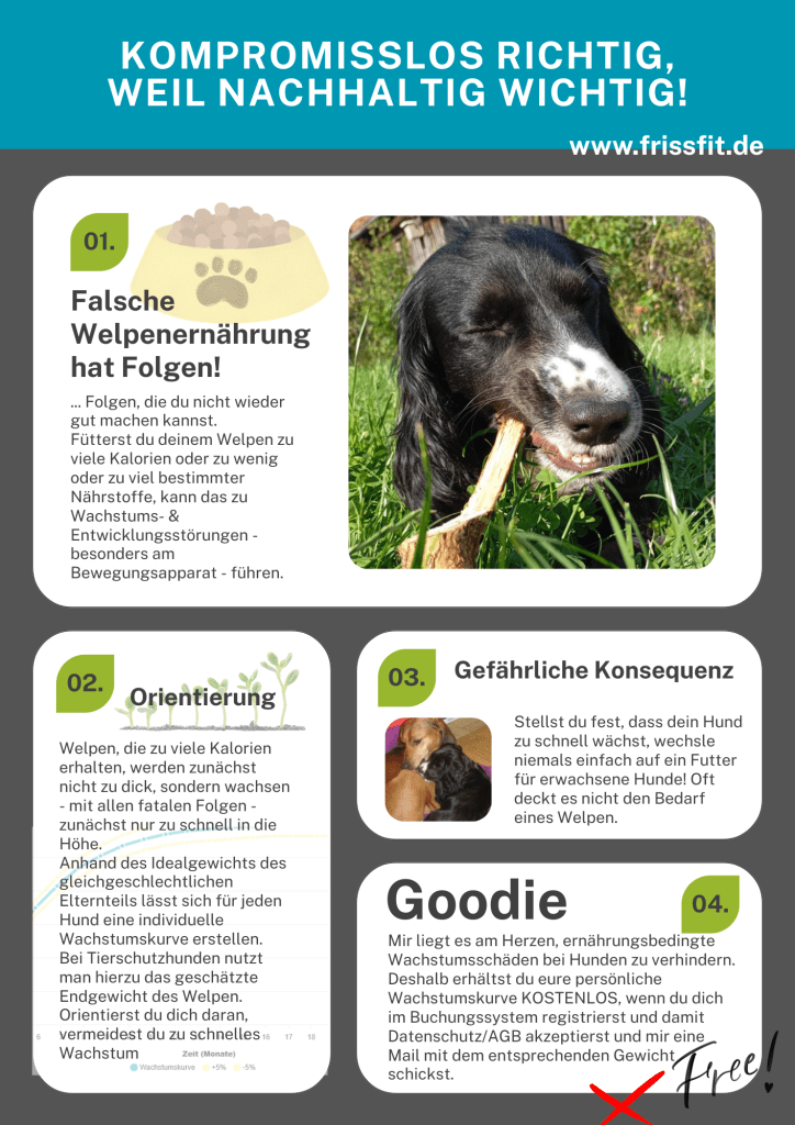 Zu Fütterungsfehlern kommt es nicht nur besonders häufig bei Eigenrationen, sondern auch bei Fertigfuttern, die nicht bedarfsdeckend sind, oder durch die Ergänzung mit zu vielen Leckerlis. Bist du unsicher, ob deine Ration für deinen Welpen/Junghund in Ordnung ist, kannst du gerne eine Rationsüberprüfung und -optimierung buchen.